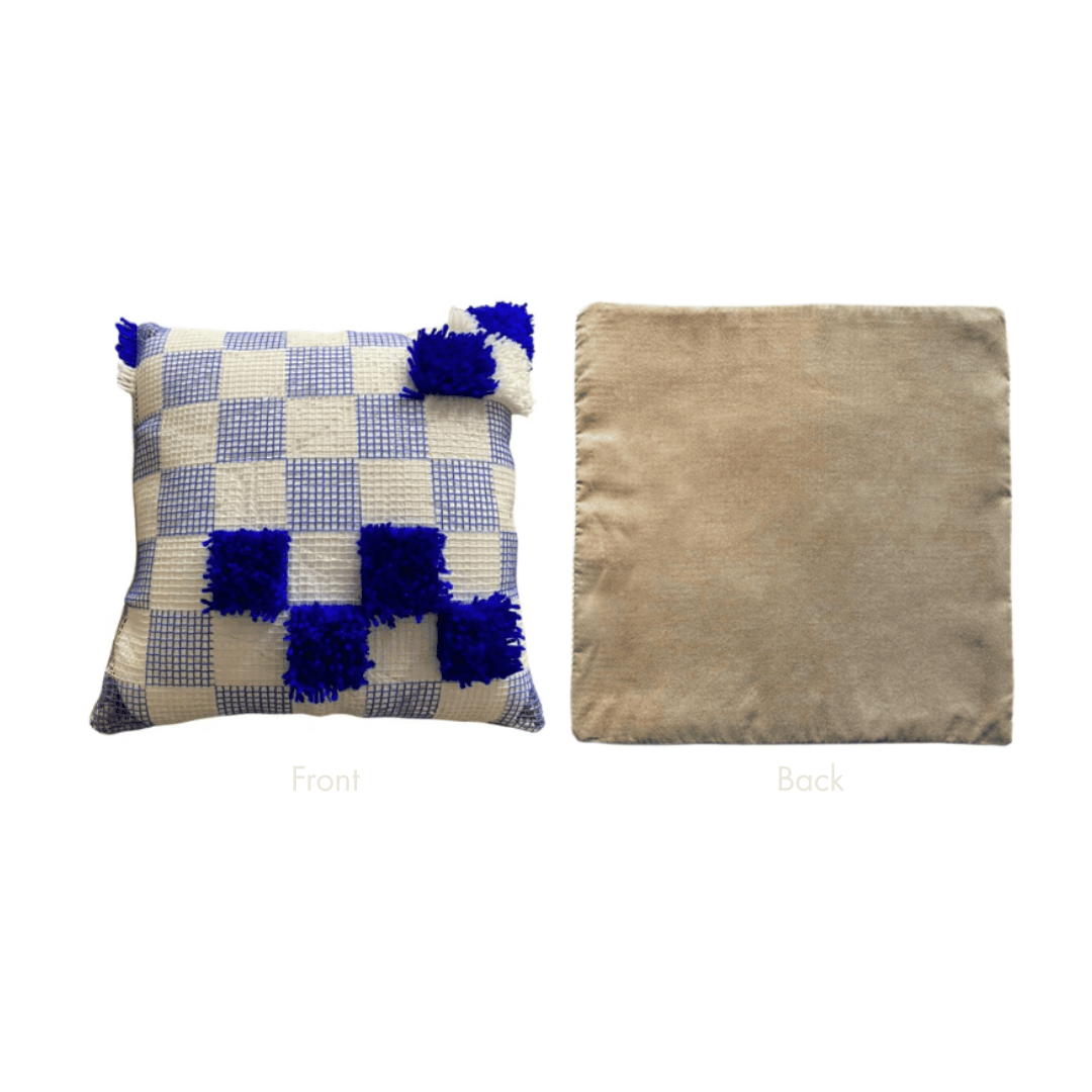 Checkered blue and white pillow on a light gray background