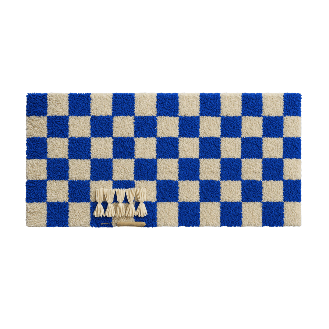 Checkered rug with blue and beige squares, accompanied by tassels on a light gray background