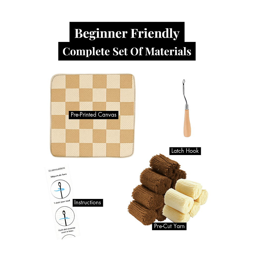 Everything you need to start right away — pre-cut yarn, canvas, printed pattern, latch hook tool, and clear instructions. No extra shopping needed, it’s all in the box.