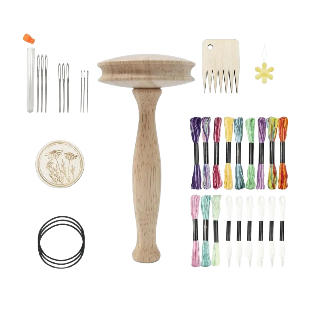 Search tags: sock repair kit, darning loom, sock darning tool, mending kit, visible mending kit, embroidery floss set, wooden darning mushroom, DIY sock repair, fabric repair tool, yarn repair kit, needle storage handle, eco friendly sewing kit, clothing repair kit, darning tool with accessories, textile mending kit, sock knitting repair, embroidery and mending kit, mending mushroom