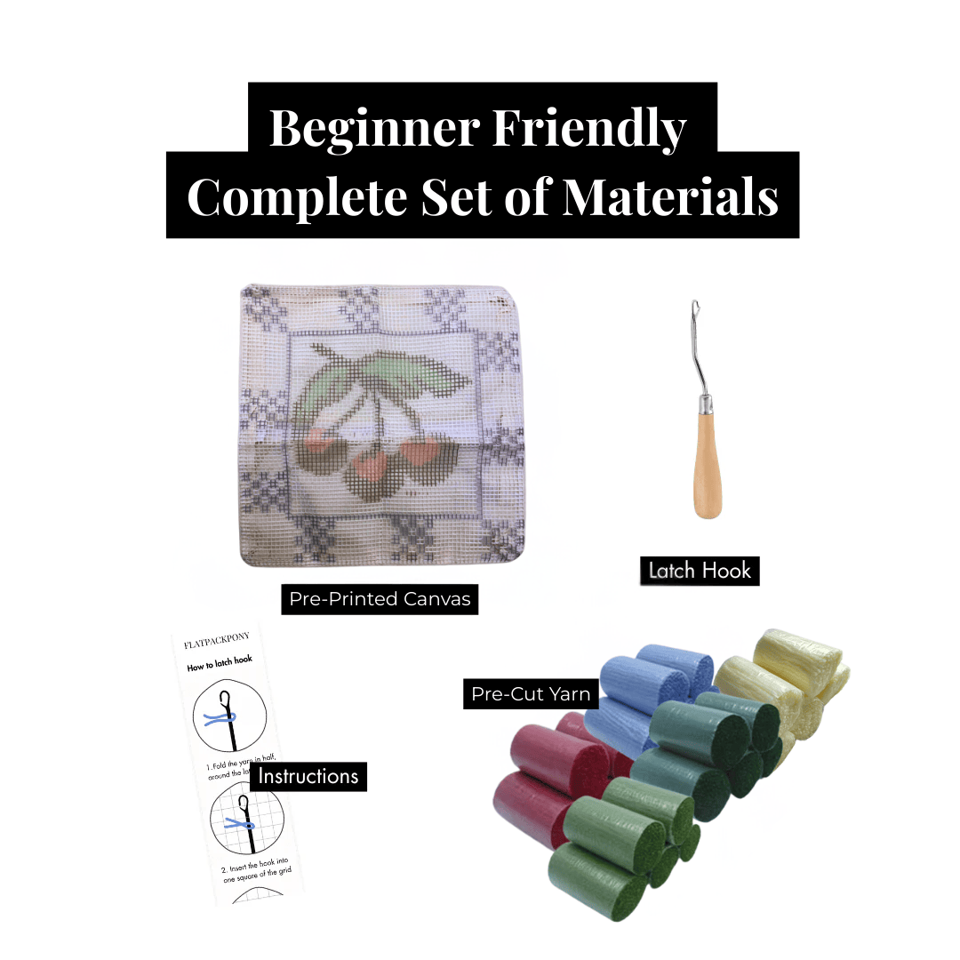 Beginner-friendly complete set of materials for latch hooking with pre-printed canvas, yarn, and latch hook.